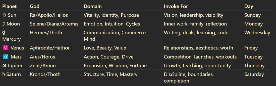 Daily Alignment: Note the day’s planetary ruler. Consider how that energy supports (or challenges) today’s tasks. Invoke the corresponding god/archetype.