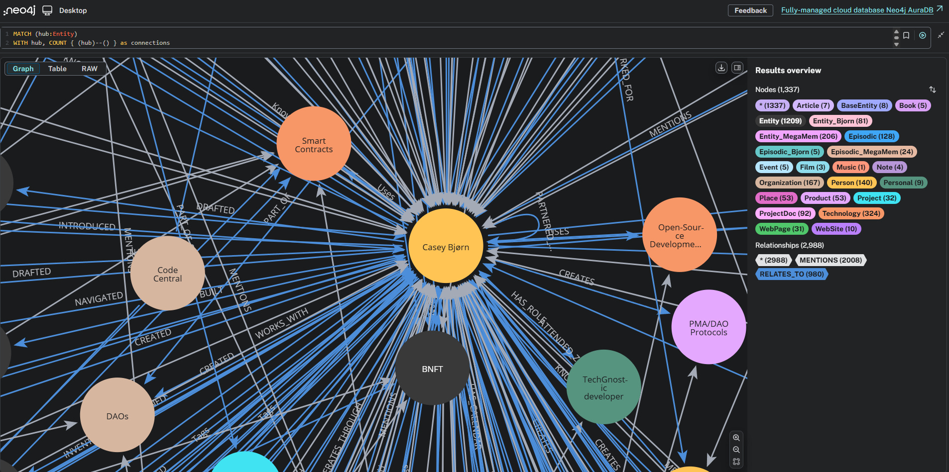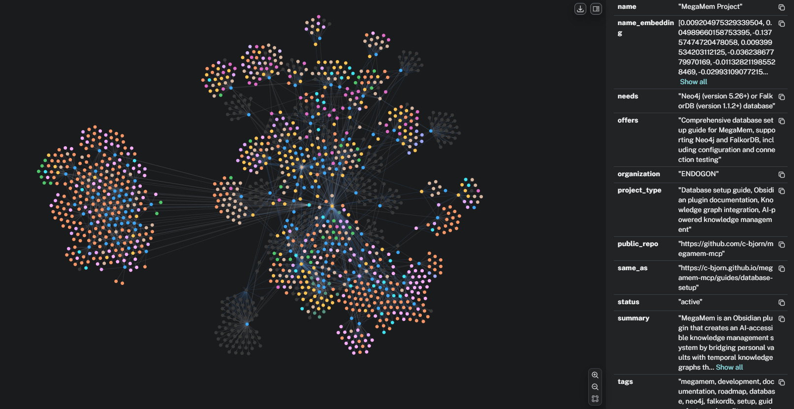 Here’s a couple snapshots of the GraphRAG data automatically generated by MegaMem in the background. Most users will never bother looking at this; developers and data engineers might like to see the proof in the pudding: