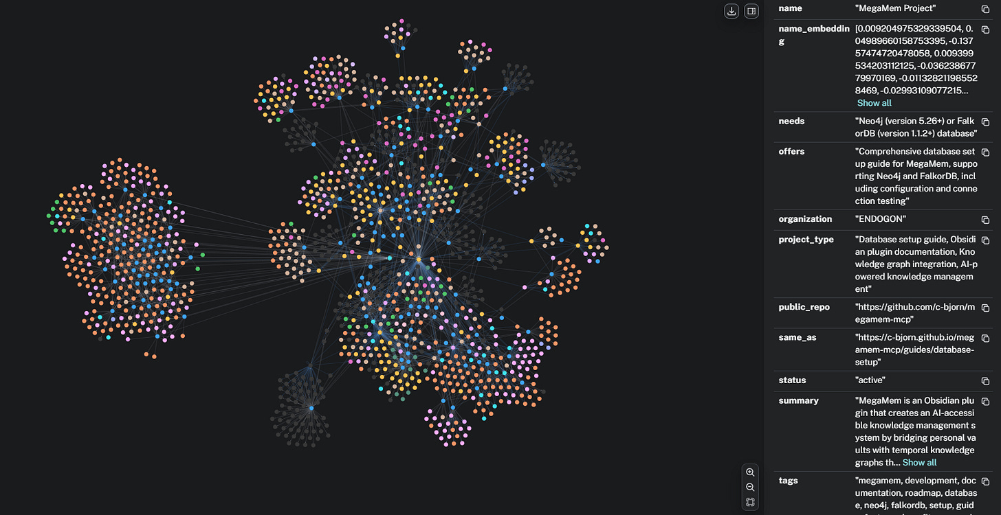 For her setup, we’ll likely get rid of the Core-5 framework entirely and skip all the Obsidian note-taking. Instead, all of her conversations, transmissions, and MasterMind sessions will write directly to MegaMem’s graph.